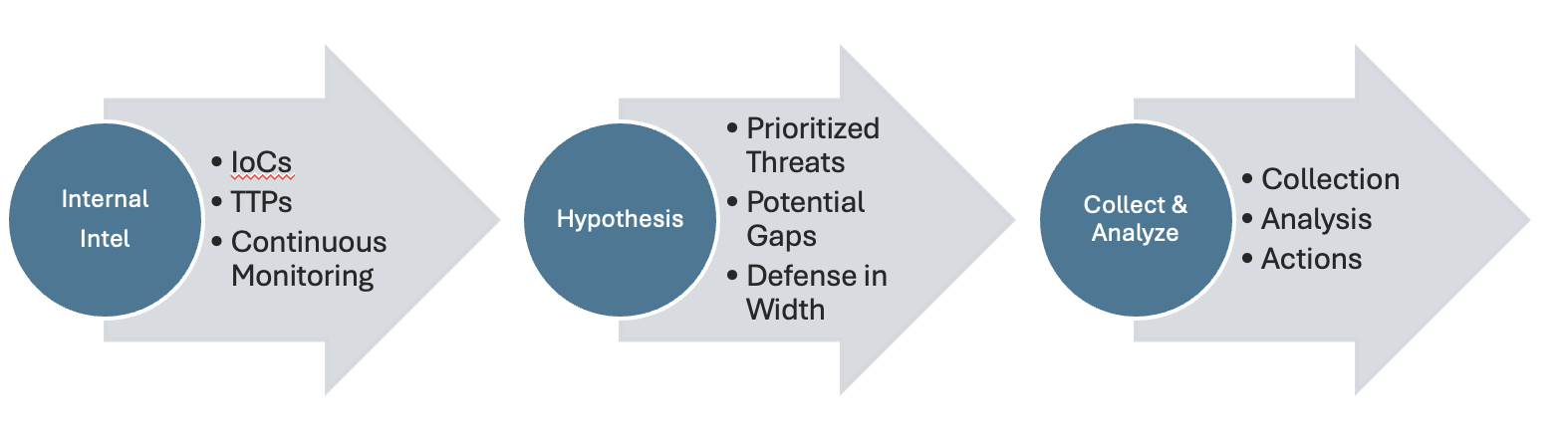 Threat hunting follows a process of initial internal intelligence, a hypothesis (see the FIRST document on the definition of hypothesis), and collection/analysis, following standard CTI lifecycle outcomes: