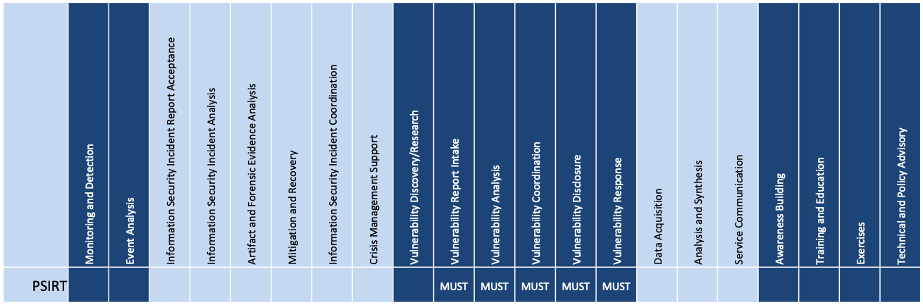 Table 3 illustrates all potential services that a PSIRT can offer. The services that PSIRTs must offer are labeled MUST.